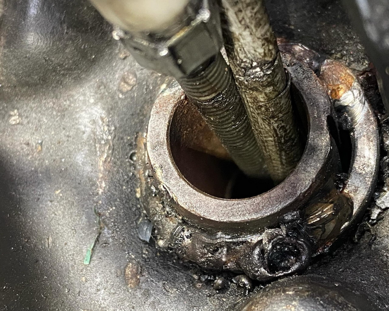 Vorgegebenes Anzugsmoment: 100 Nm für beide obere Muttern. Ein seitlich anzusetzender Hakenschlüssel scheidet hier aber aus, da alle Kronenmuttern im Lenker sitzen und nicht seitlich zugängig sind.