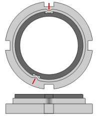 Diese hat zwei Nasen nach innen, die die Position vorgeben (von oben gesehen bei 12:00 Uhr und 7:00 Uhr). Haben diese inneren Nasen schon zu viel Spiel, sollte die Scheibe gegen eine neue bzw. strammer sitzende getauscht werden. Die nach oben zeigenden Nasen stehen nach dem Verbauen auf 3:00 Uhr und 9:00 Uhr.